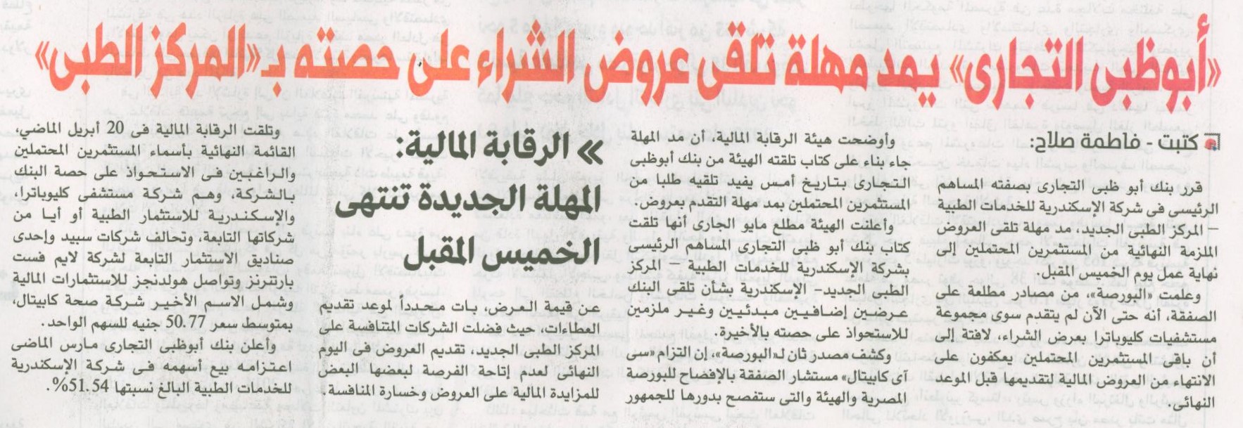 : ((أبوظبى التجارى)) يمد تلقى عروض الشراء على حصته ب (( المركز الطبي)).