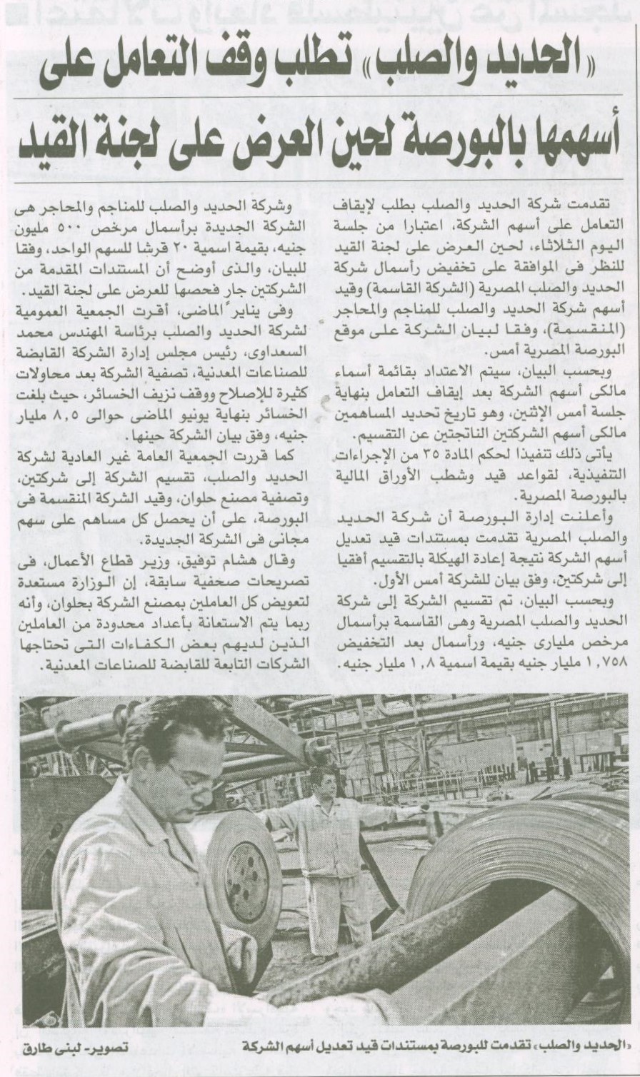 (( الحديد والصلب )) تطلب وقف التعامل على أسهمها بالبورصة لحين العرض على لجنة القيد .