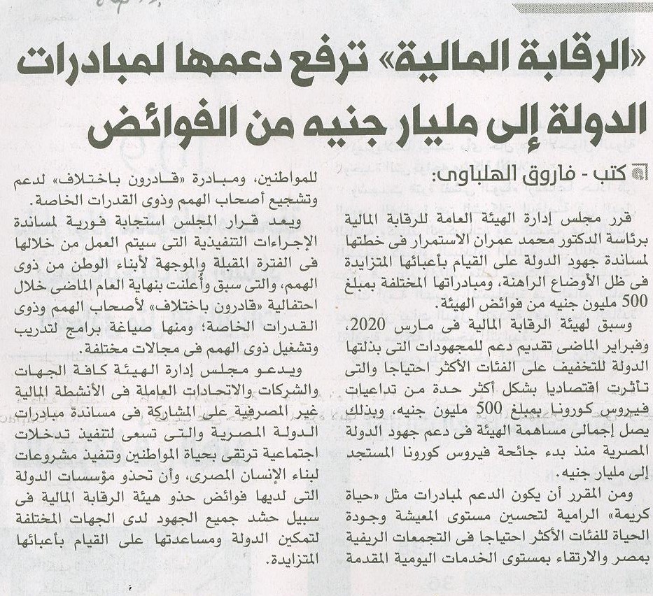 (( الرقابة المالية )) ترفع دعمها لمبادرات الدولة إلى مليار جنية من الفوائض.