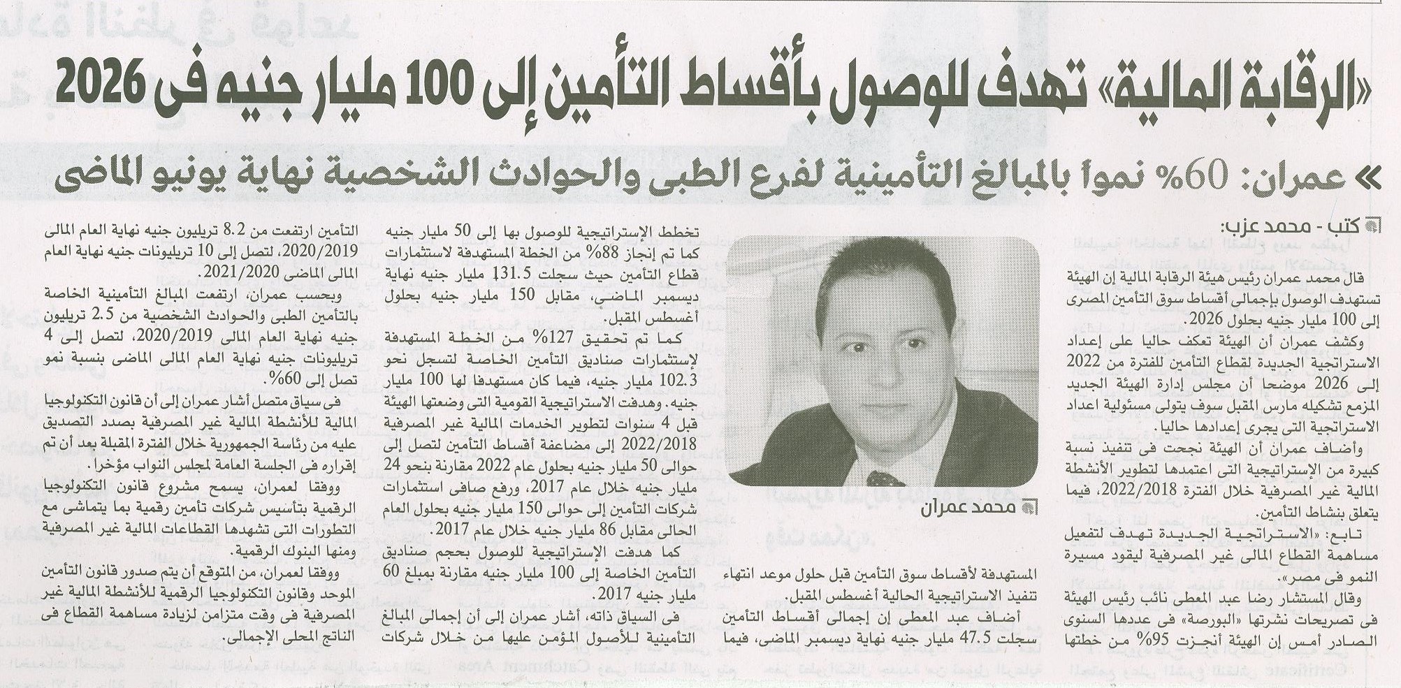 (( الرقابة المالية )) تهدف للوصول بأقساط التأمين إلى 100 مليار جنية في 2026.