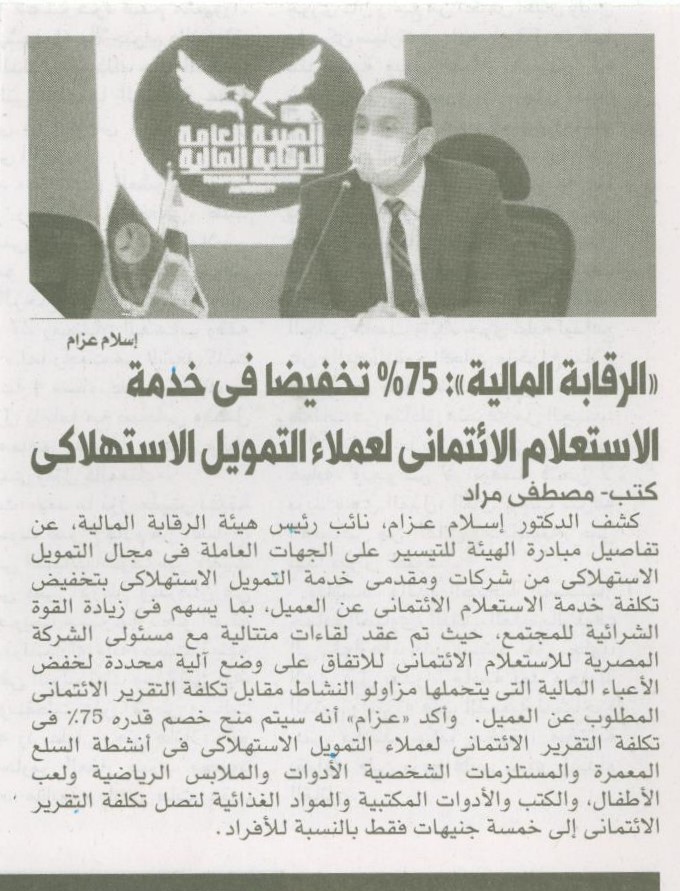 : (( الرقابة المالية )) : 75% تخفيضاً في خدمة الاستعلام الائتمانى لعملاء التمويل الاستهلاكى .