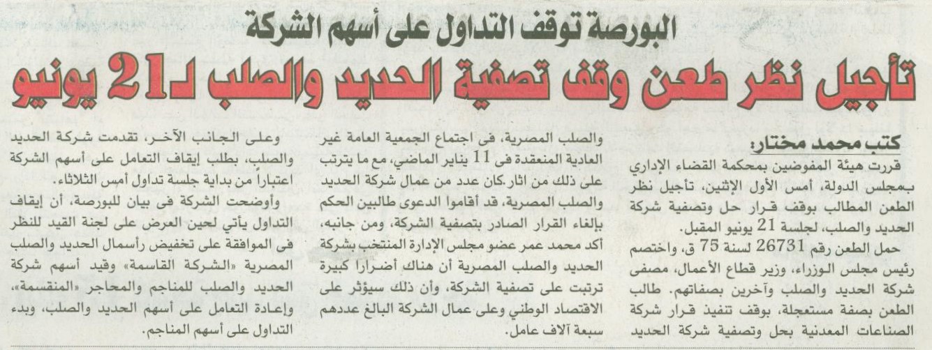تأجيل نظر طعن وقف تصفية الحديد والصلب لـ 21 يونيو .