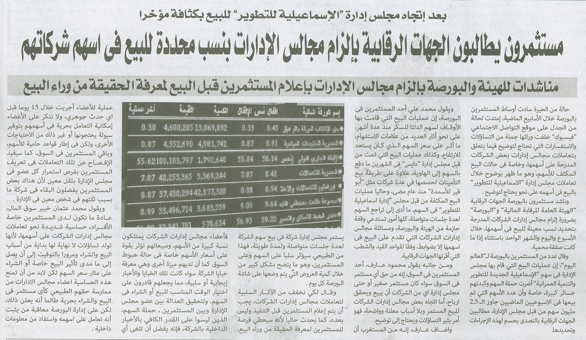 مستثمرون يطالبون الجهات الرقابية بإلزام مجالس الإدارات بنسب محددة للبيع في اسهم شركاتهم .