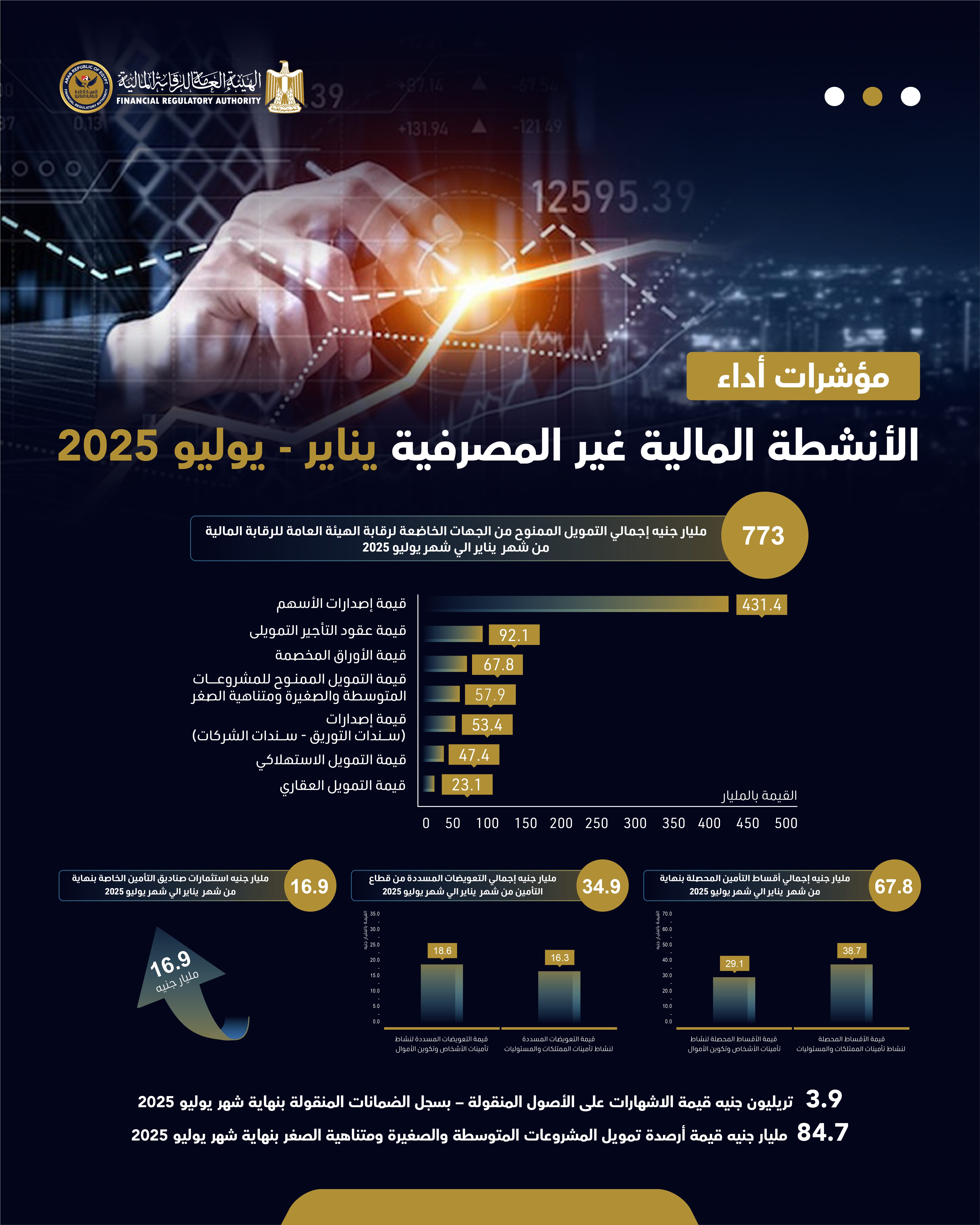 أظهرت أحدث التقارير الصادرة من الهيئة العامة للرقابة المالية، أن إجمالي التمويل الممنوح من خلال الجهات الخاضعة لرقابة الهيئة (أنشطة سوق رأس المال، أنشطة التمويل غير المصرفي) بلغ قيمته 773 مليار جنيه خلال الفترة من يناير إلى نهاية شهر يوليو 2025 وذلك على النحو التالي: